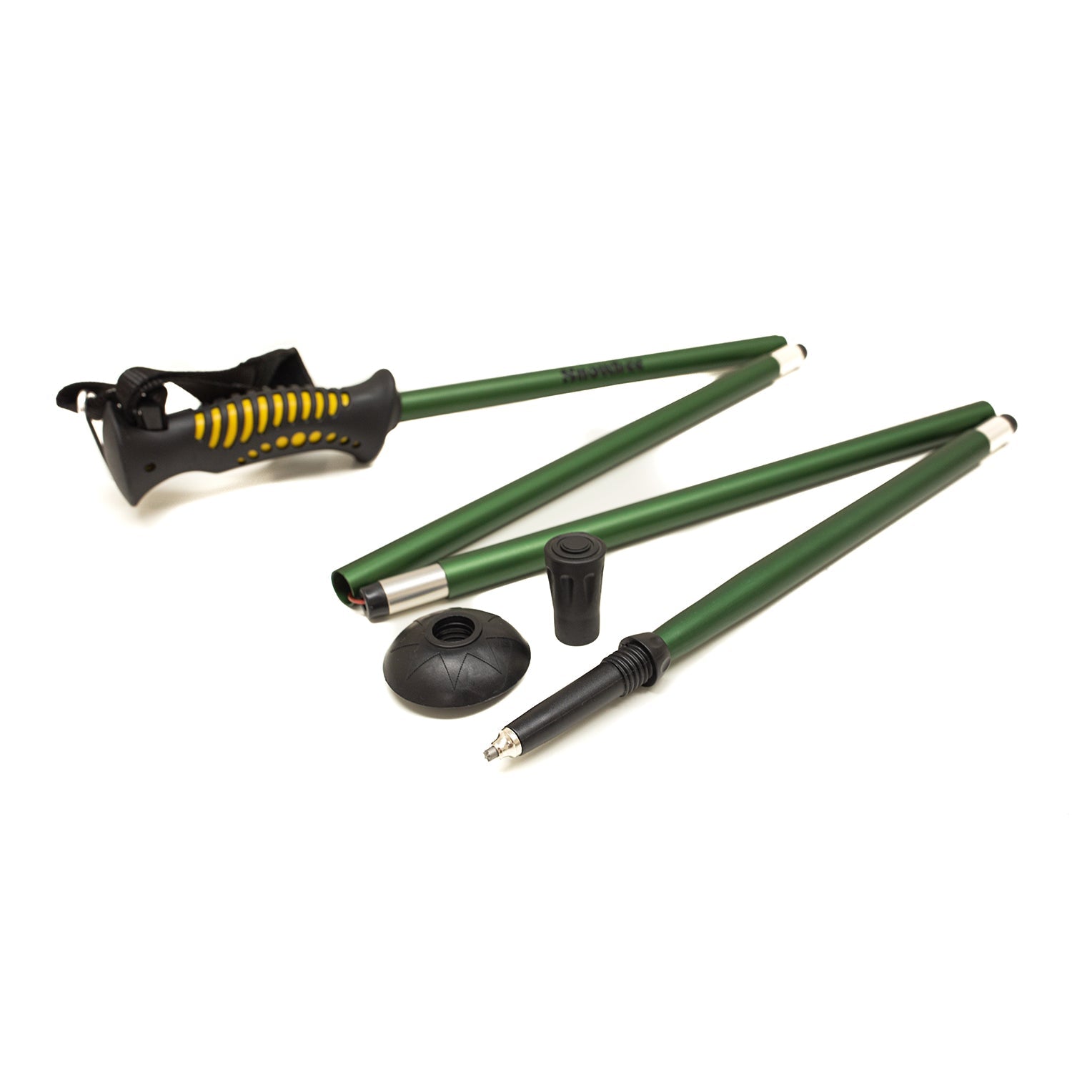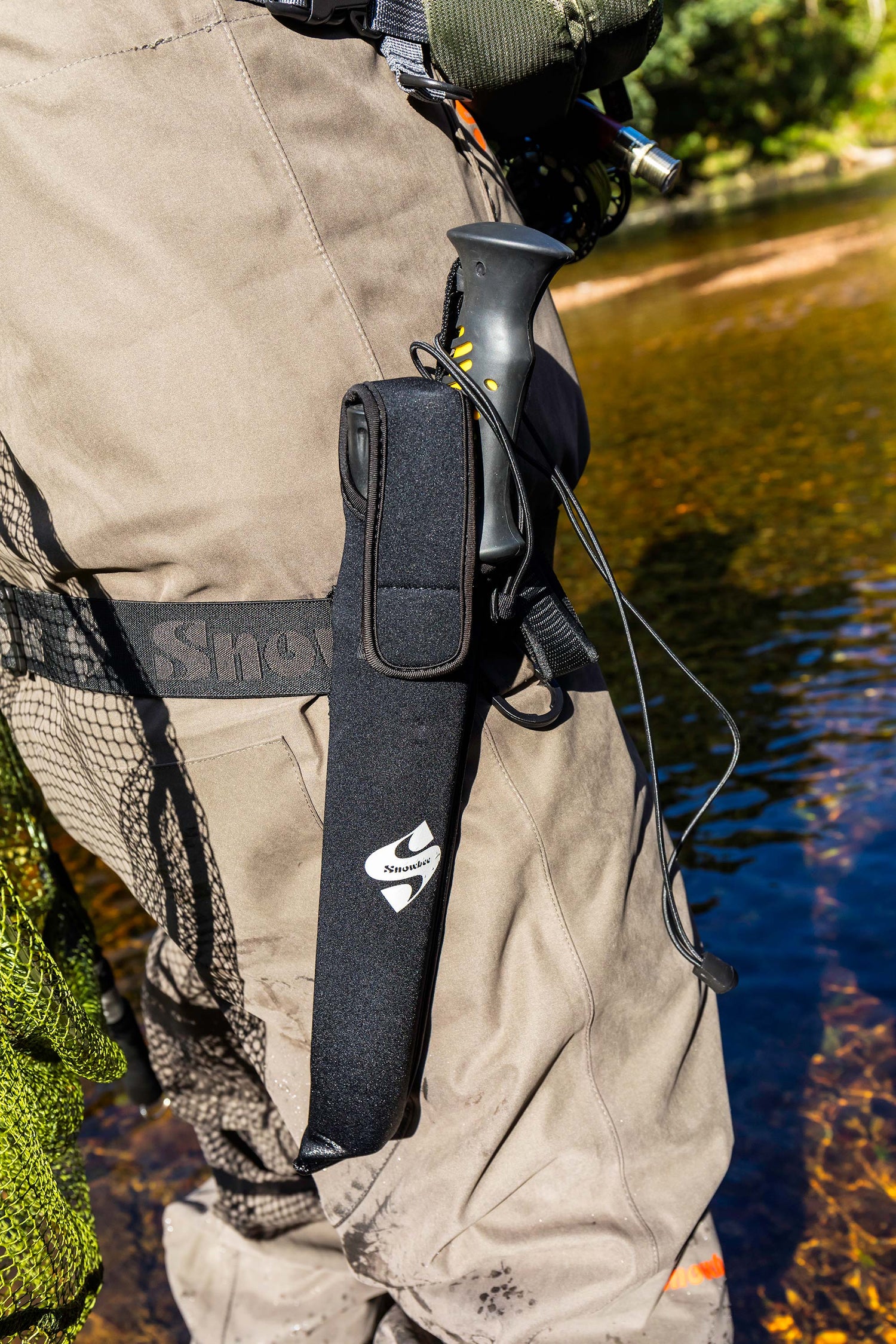 A lightweight, slim profile aluminum wading staff for reduced water resistance. The 4-section design locks firmly in place with a sliding collar, so the staff cannot collapse even if the rubber cap is caught between rocks. Remove the "silent wading" rubber cap and a carbide steel tip is exposed for extra traction. This staff comes with an optional screw-on trekking baskets to spread the load in soft sand, mud, or snow. Ergonomic rubber handle for comfort and positive grip, with an adjustable wrist strap and detachable elasticated lanyard. At 15”olded up, the wading staff packs down into a neat neoprene belt holster.