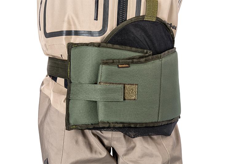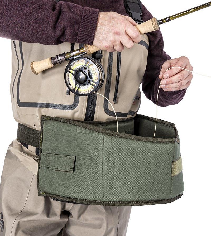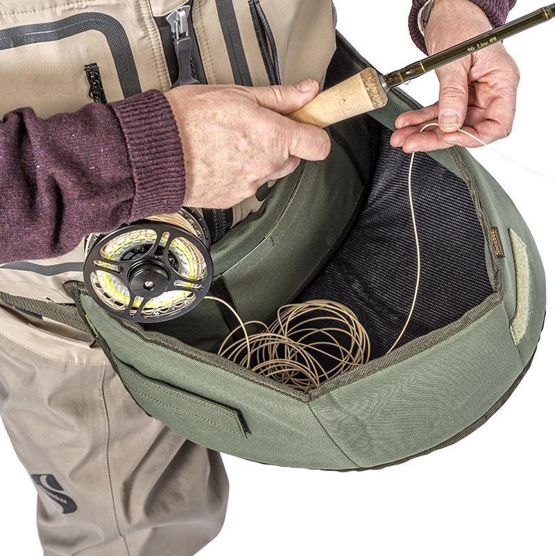 This cleverly designed line tray folds flat against the body for convenient storage when not in use. A mesh base with fold-down baseboard holds the tray open and prevents water from filling the tray from below and tangling the line when deep wading or saltwater fly fishing. A Velcro pocket is inside for convenience.
